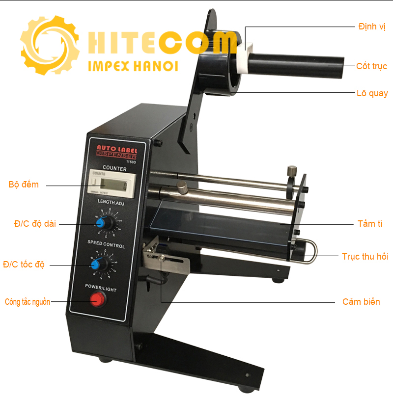 Cấu tạo máy máy bóc tách tem nhãn tự động 1150D có cấu tạo dáng đứng toàn bộ thân máy và hệ thống nút hiển thị điều khiển nằm bên tay trái, bên trên là bộ đếm hiển thị số hàng nhãn cấp, khi gạt xuống là lock (khóa đồng hồ), gạt lên và bấm nút thì sẽ trở về chế độ mặc định là số 0, phần giữa là 2 nút vặn điều chỉnh độ dài nhãn ở phía trên, mỗi một số tương đương với 10mm, nút thứ hai theo hướng dưới là điều chỉnh tốc độ nhả tem, nút đỏ dưới cùng là nút nguồn khởi động ON/OFF, toàn bộ phía bên phải của máy là: giá đỡ cuộn nhãn ở phía trên, phần giữa là hệ thống các thanh ngang căng giữa tem nhãn, phía trước các thanh là miếng tì bằng mi-ca trong suốt, phần ngoài cùng là thiết bị cảm biến quang, phần dưới chân đế có 4 nút cao su giữ cho máy có thể đứng vững trong suốt quá trình vận hành.